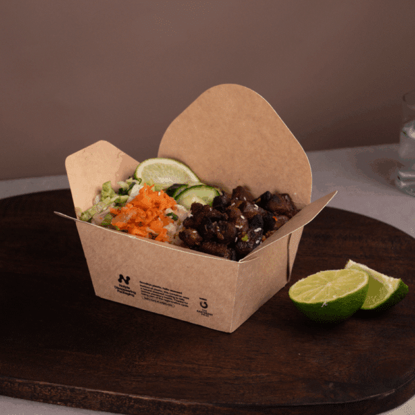 The Notpla™ Food Box [750ml], a smarter choice for takeaway and food service - perfect for salads, sides and pasta dishes. Made with a 100% plastic & PFAS-free coating officially recognised under the EU Single-Use Plastic Directive. Offers guilt-free disposal in any waste stream. Keeps your business compliant, your impact low, and your packaging hassle-free.
